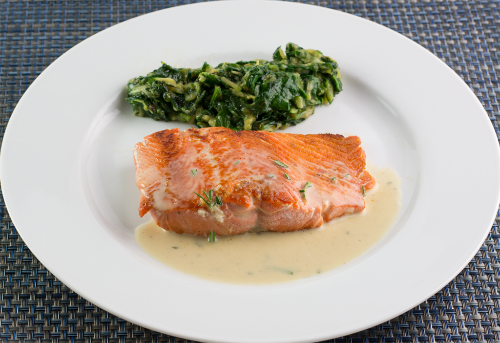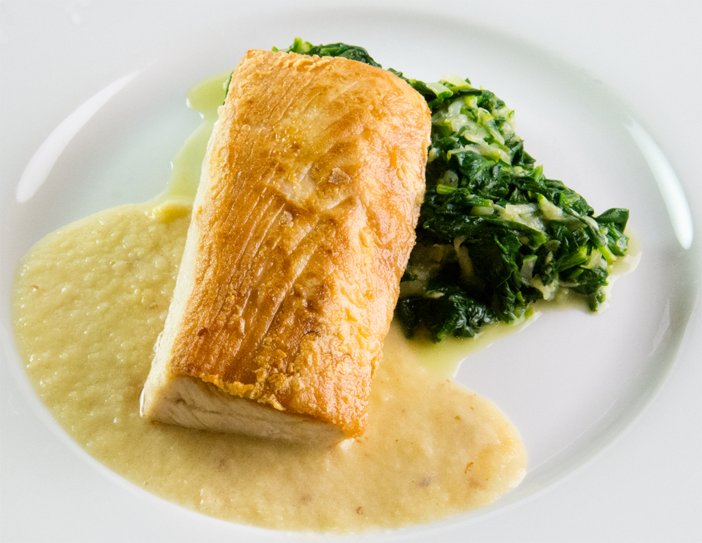 Sear-roasted Chilean Sea bas with Herb-Butter Sauce on a bed of Peas and Panchetta